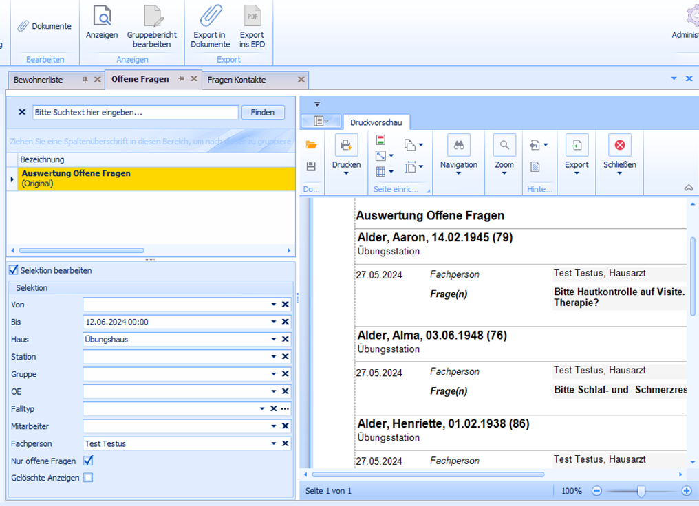 Im Modul offene Fragen (Report) können alle noch nicht beantwortete Fragen ausgedruckt werden.