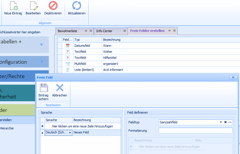 Mit neuer Eintrag können sie ein Feld hinzufügen. Geben sie in der Spalte Bezeichnung auf der linken Seite den Namen des Feldes ein. Danach wählen sie auf der rechten Seite die Eigenschaft des Feldes.