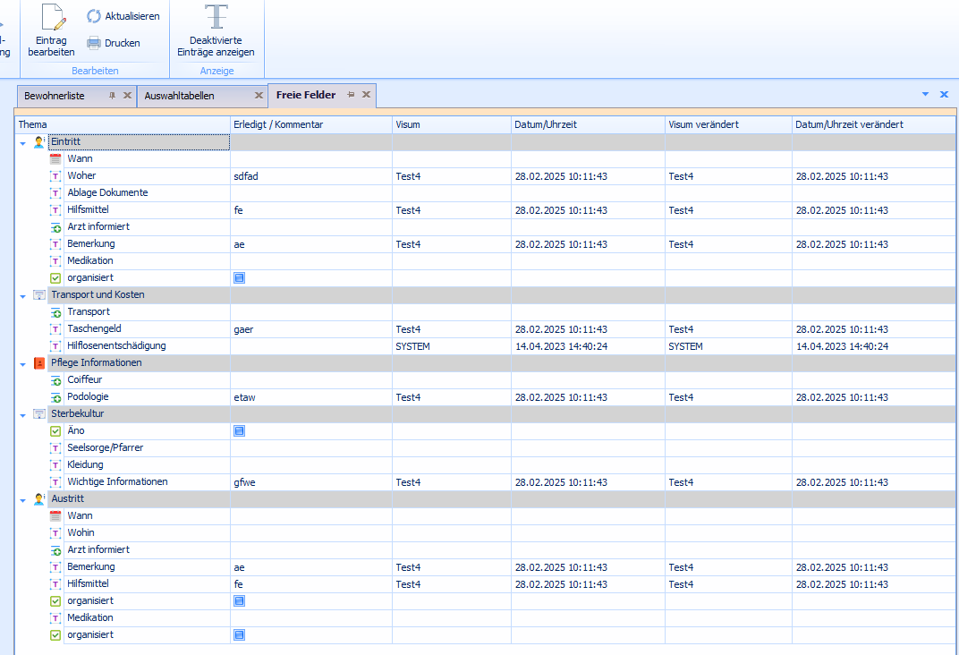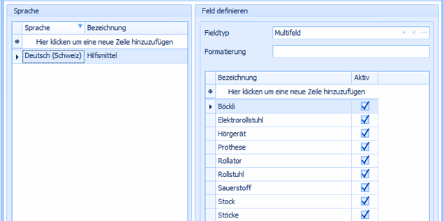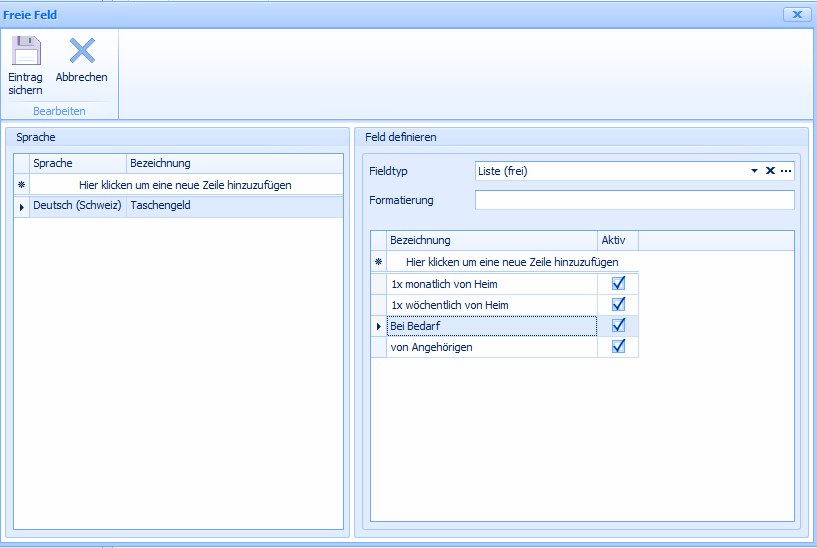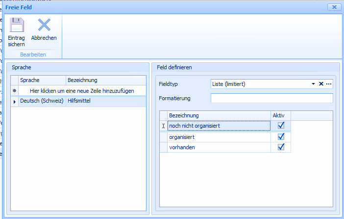Hier können mehrere Auswahlmöglichkeiten in der Felderliste hinterlegt. In den Freien Feldern kann dann jeweils eine Auswahl hinterlegt werden und im Freitext noch etwas Zusätzliches dazu geschrieben werden.