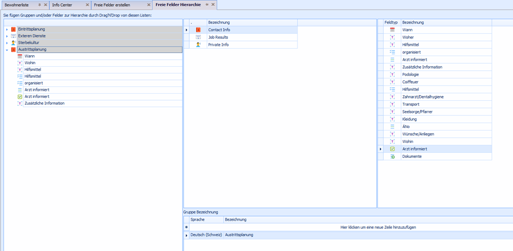 Anschliessend kann der Name/Titel der Gruppe beim unteren Feld Gruppe Bezeichnung in der Spalte Bezeichnung nach Bedarf angepasst werden. (hier von Contact Info zu Austrittsplanung)