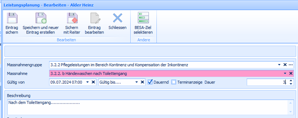 Stellen Sie Dauer in Minuten für die Massnahme ein, diese kann auch beim erledigt mit Verlauf geändert werden. Wird die Massnahme mehrfach durchgeführt, muss die Dauer addiert werden.