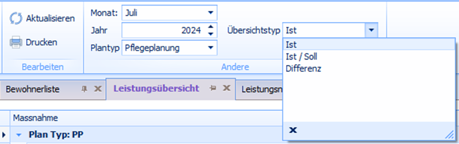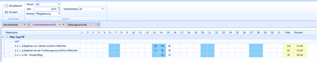 Die Leistungsübersicht dient Ihnen zur Übersicht, wieviel Zeit Sie bei jedem Bewohner für die Pflegemassnahme dokumentiert oder geplant haben.