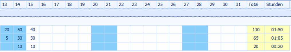 Alle geplanten und/oder «abgeblauten» Leistungen, bei welcher eine Dauer hinterlegt ist, werden für einen Monat gesammelt dargestellt.