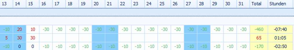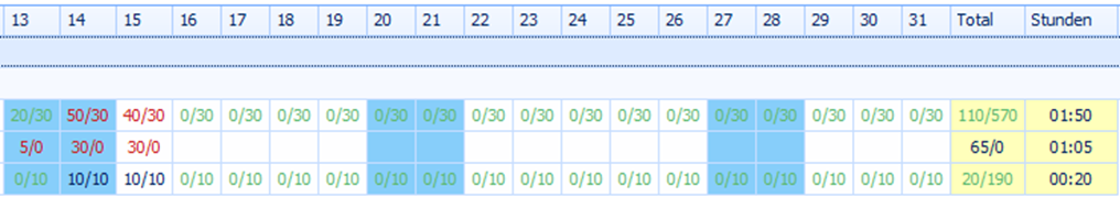 Differenz: Hiermit wird die Differenz zwischen der geplanten und der erbrachten Leistung dargestellt. Weniger Minuten als geplant werden grün mehr als geplant rot dargestellt.