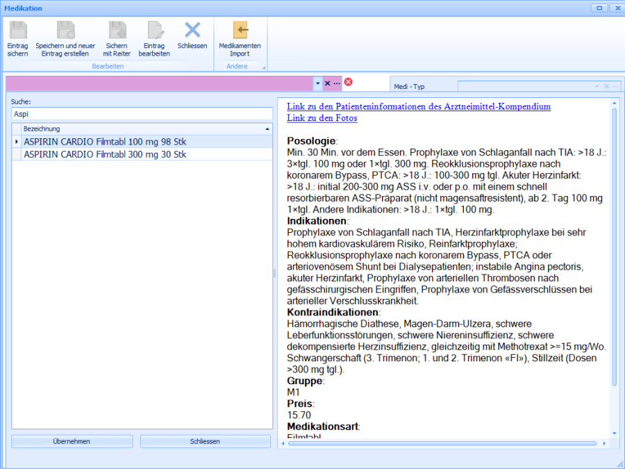 Wenn Sie easyDOK mit dem CareIndex verwenden, werden Ihnen alle Informationen zum Medikament automatisch mitgeliefert(Beipackzettel). Unter anderem auch die Medikationsart und der