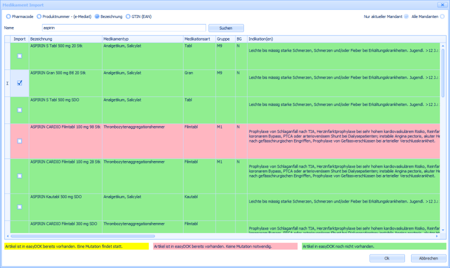 Markieren Sie das gewünschte neue Medikament mit einem Häkchen in der Spalte Import und klicken Sie auf OK. Das Medikament steht Ihnen nun zur weiteren Verordnung zur Verfügung.