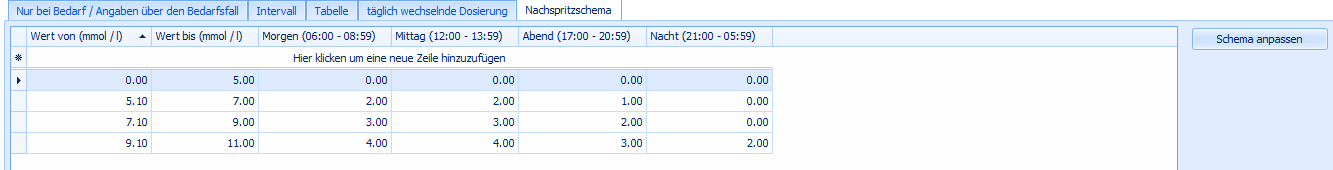 Füllen Sie mit Hilfe der Auswahltabellen alle Felder aus. Unter Wert von (mmol / l) und Wert bis (mmol / l) tragen Sie die entsprechenden BZ-Werte ein.
