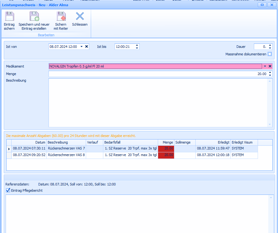 Im unteren Teil der Eingabemaske sehen Sie ob und wieviel der Bewohner von diesem Medikament in den letzten 24 Stunden bereits verabreicht bekommen hat. Haben Sie beim Medikament eine maximale Abgabe hinterlegt, wird Ihnen ausserdem, in orange angezeigt, wann die Menge erreicht ist und in rot, wenn die Menge überschritten wird.