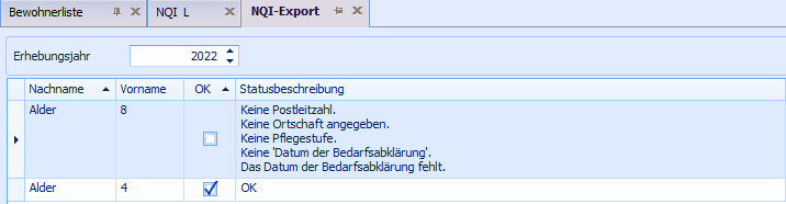 In einem neuen Fenster werden ihnen alle Bewohner mit korrekt abgeschlossener NQI Erhebung angezeigt.