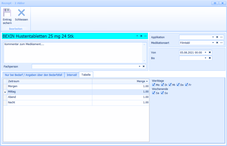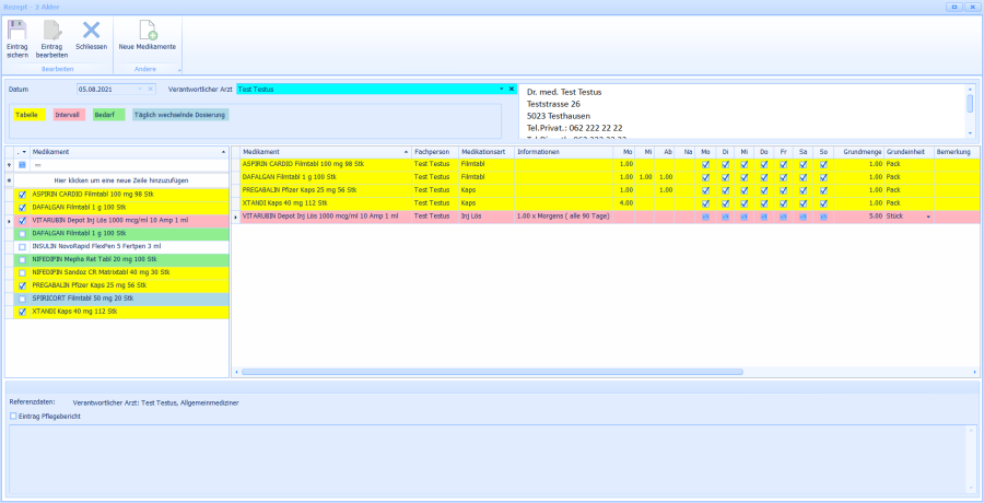 Die Eingabemaske öffnet sich und zeigt die verordneten Medikamente aus dem Modul Medikation an.