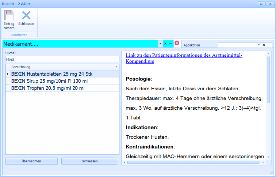 Nach Eintrag sichern erscheinen die bestellten Medikamente auf der Oberfläche des Rezeptmoduls.