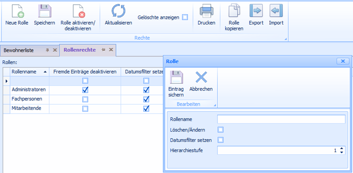 Hier könne sie eine neue Rolle definieren, einen Rollennamen vergeben und bestimmen, ob die Rolleninhaber fremde Einträge deaktivieren können, dies empfiehlt sich nur für Administratoren und ob ein Datumsfilter gesetzt werden kann.