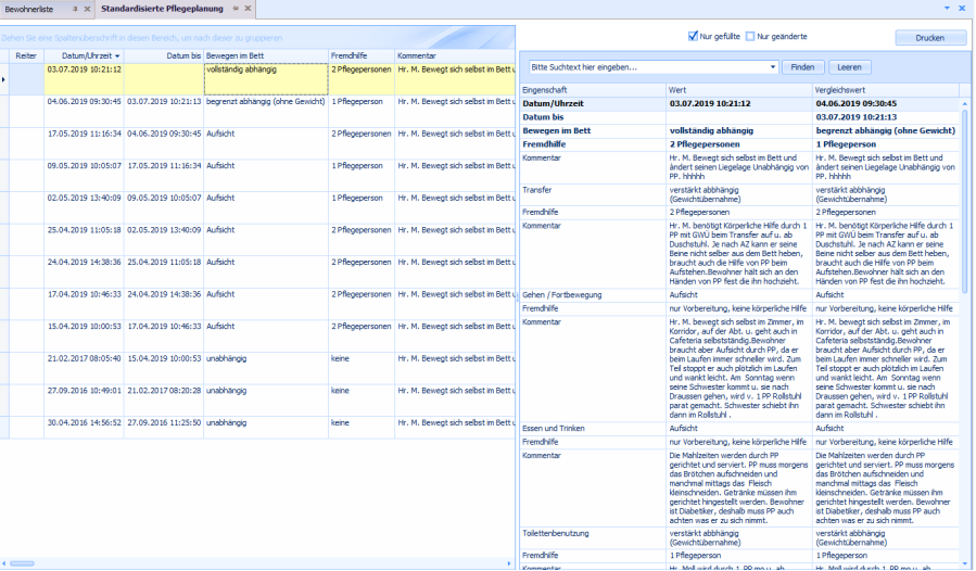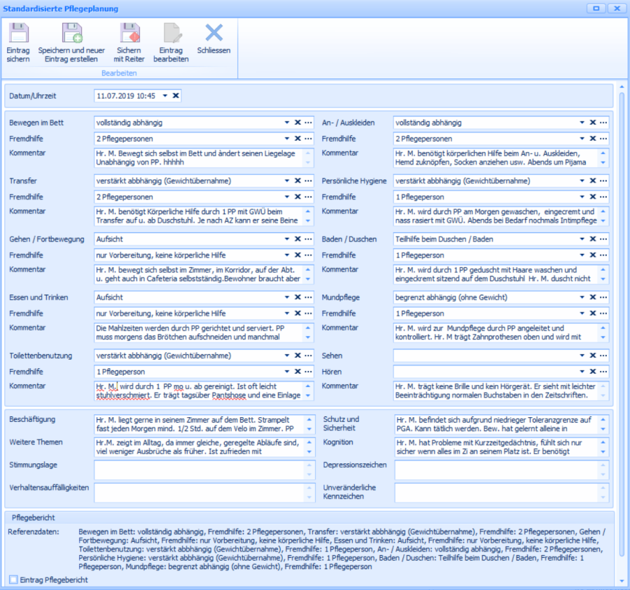 Im Verlegungsbericht wird die aktuelle Pflegesituation mit der standardisierten Pflegeplanung für den Empfänger schnell ersichtlich.