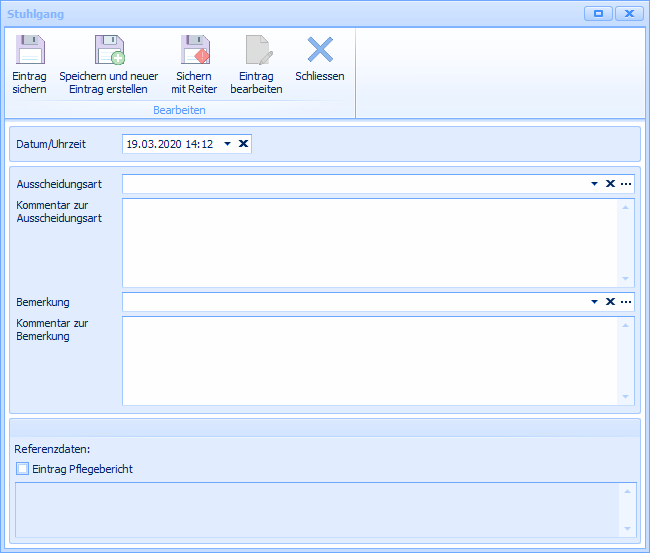 Im Assembly Stuhlgang können Sie die Ausscheidung Ihrer Bewohner dokumentieren. In der Auswahltabelle Bemerkung können Sie zusätzliche Ausscheidungsarten hinterlegen.