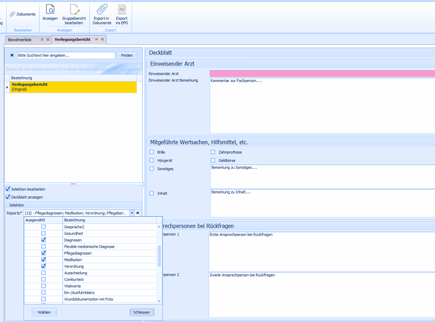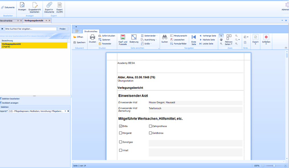 Wird ein Bewohner verlegt, ist es wichtig, dass Sie schnell die richtigen Dokumente ausdrucken und mitgeben können. Zu diesem Zweck hat ihre Administration bereits den Verlegungsbericht vordefiniert.