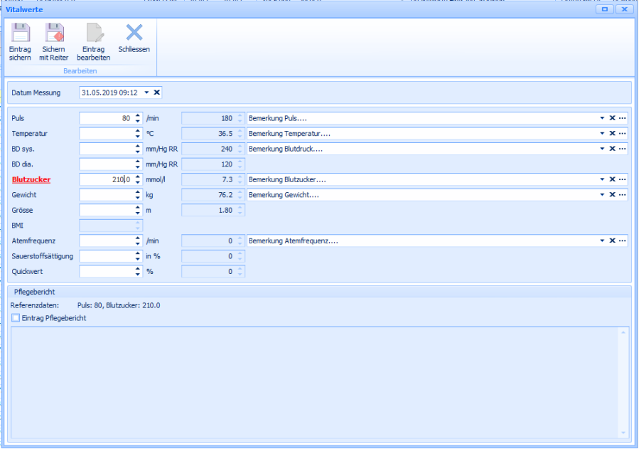 Hier können Sie die gemessenen Vitalwerte eingeben. Sie sehen mittig der Eingabemaske die zuletzt gemessenen Werte. Mit Hilfe der Auswahltabellen können Sie ergänzende Bemerkungen hinterlegen. Der BMI errechnet sich automatisch auch bei gegebenenfalls Amputationen von Gliedmaßen (siehe Anleitung - Amputation). Voraussetzung ist das die Größe korrekt eingegeben wurde. Bei der Eingabe eines neuen Vitalparameters werden Ihnen die letzten Vitalwerte angezeigt.
