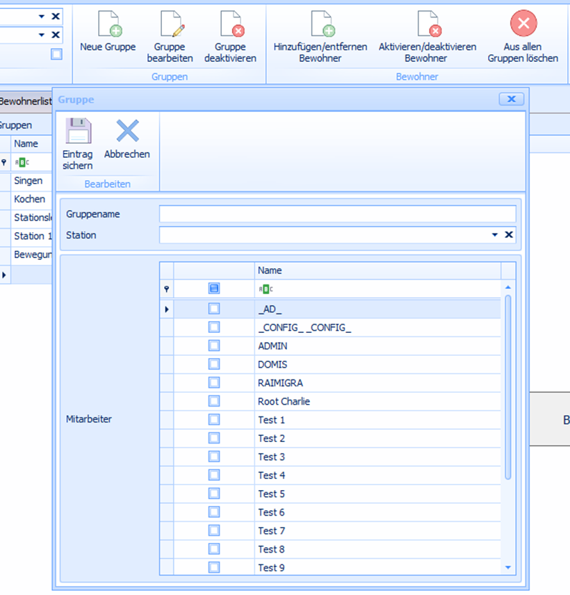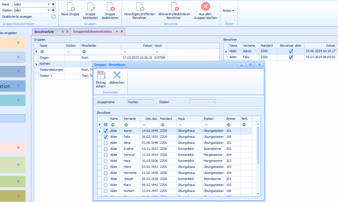 Wählen Sie die Station aus, können Sie nur Bewohner der Gruppe zuteilen, welche auf dieser Station untergebracht sind.
