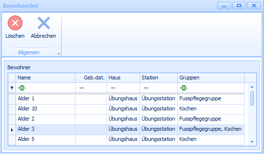 Mit dem Entfernen aus der Gruppe, werden alle zukünftig geplanten Termine dieser Gruppe, bei diesem Bewohner deaktiviert. Mit dem Hinzufügen zu einer Gruppe, werden alle zukünftig geplanten Termine dieser Gruppe, bei dem Bewohner hinzugefügt.