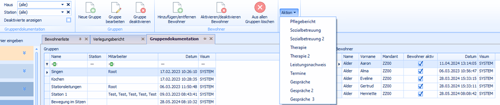 Markieren Sie dazu eine Gruppe aus Ihrer Tabelle auf der linken Seite, danach wählen Sie die auszuführende Aktion. Für alle Bewohner, welche auf der rechten Seite dieser Gruppe zugeteilt und mit Bewohner aktiv hinterlegt sind, gilt diese Aktion.