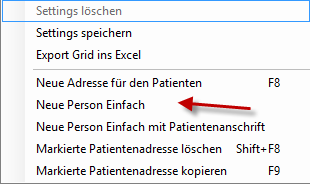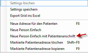 Ist die Anschrift der Adresse identisch mit der Anschrift der Patienten (z.B. Ehefrau an gleicher Adresse), kann die Erfassung vereinfacht werden, in dem über den Menüpunkt Neue Person Einfach mit Patientenanschrift das Minisubjekt erfasst wird.