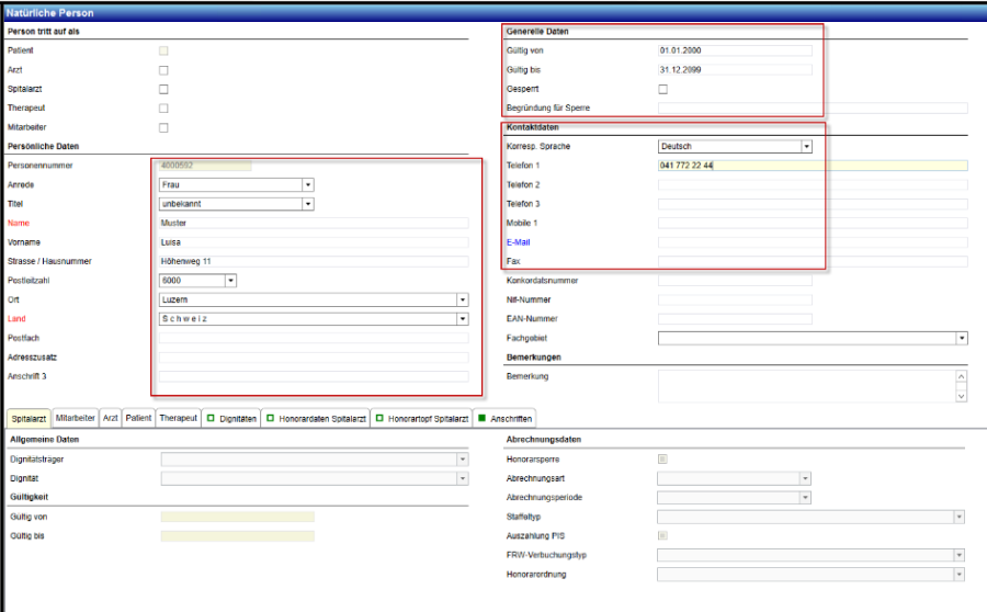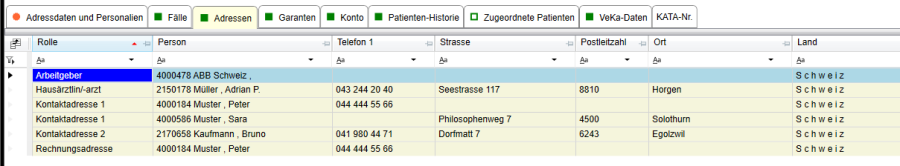 Auf dem Patienten im Register Adressen können alle Adressen zugeordnet werden. Ausnahmen sind einweisender Arzt und behandelnder Arzt, diese sind fallbezogen, wobei der behandelnde Arzt nicht zwingend erfasst werden muss.