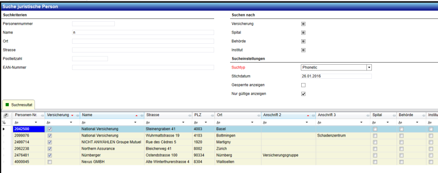 Sollen Personen/Institutionen einer bestimmten Ortschaft gesucht werden, dann muss die Ortschaft und beim Namen ein % eingetragen werden.