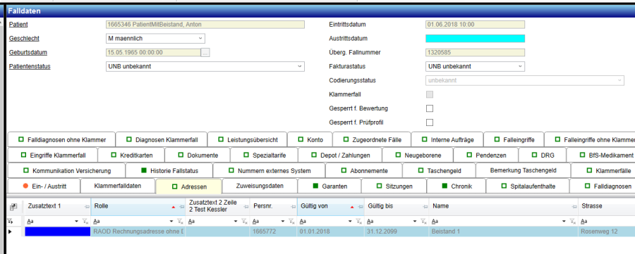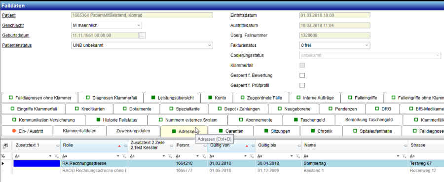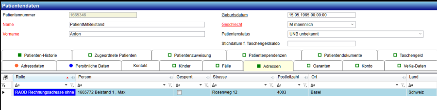 Auf Patientenebene kann eine Adresse mit der neuen Rolle 'Rechnungsadresse ohne Debitor' erfasst werden. Diese Rolle ist vor allem für die Erfassung eines Beistandes vorgesehen. Die Erfassung erfolgt ausschliesslich auf Patientenebene (Reiter 'Adressen' beim Patienten) und gilt dann für alle Fälle des Patienten.