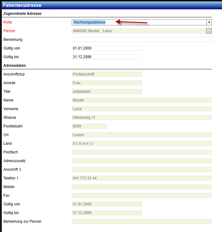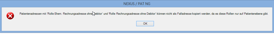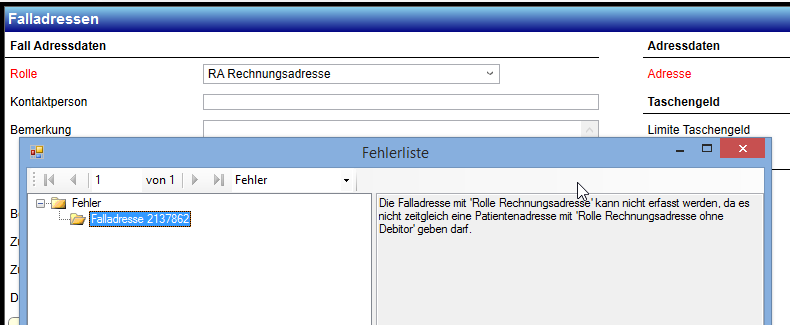 Ist auf Patientenebene eine gültige Adresse mit der Rolle ‚Rechnungsadresse ohne Debitor' vorhanden, dann darf auf Fallebene keine Rechnungsadresse erfasst werden: