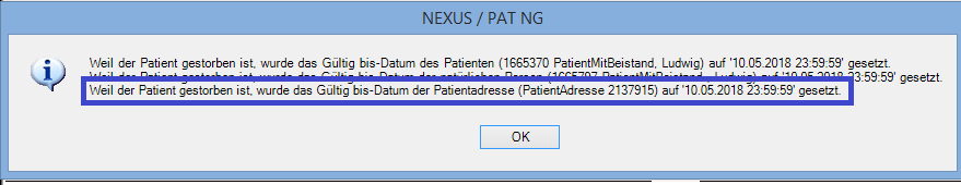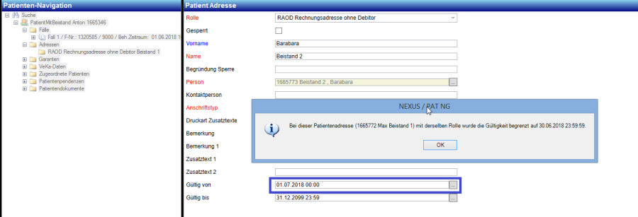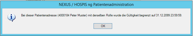 Nach Bestätigung der Änderung wird zusätzlich die Patientenadresse mit der Rolle 'Rechnungsadresse ohne Debitor' beendet.