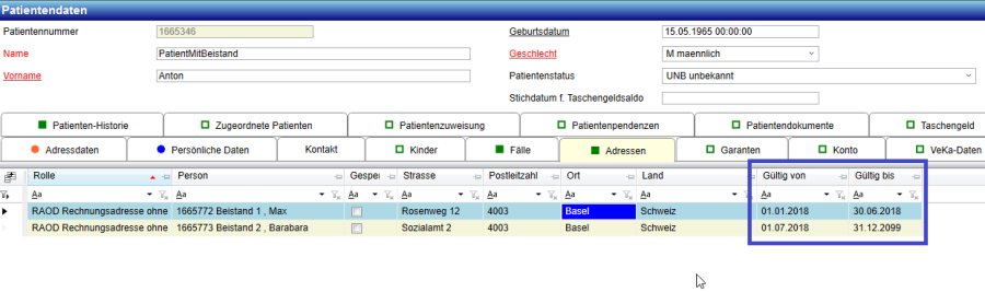 Wechselt die 'Rechnungsadresse ohne Debitor' (der Beistand), so wird das Gültig bis-Datum der alten 'Rechnungsadresse ohne Debitor' (Beistandsadresse) entsprechend gesetzt und eine neue 'Rechnungsadresse ohne Debitor' (Beistandsadresse) erfasst. Eine zeitliche Überlappung von Patienten-Adressen mit der Rolle 'Rechnungsadresse ohne Debitor' ist nicht erlaubt.