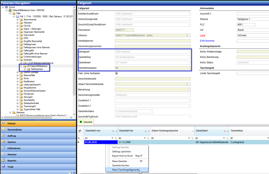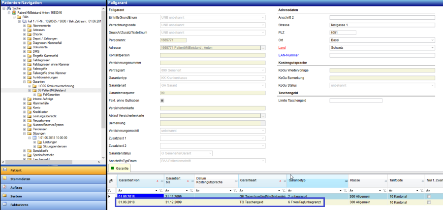 Wenn zum Eintritt eines Falles eine Patientenadresse mit dieser Rolle vorliegt, dann kann auf dem generierten Patientengaranten (Garantensequenz 99) eine Taschengeldgarantie erfasst werden.