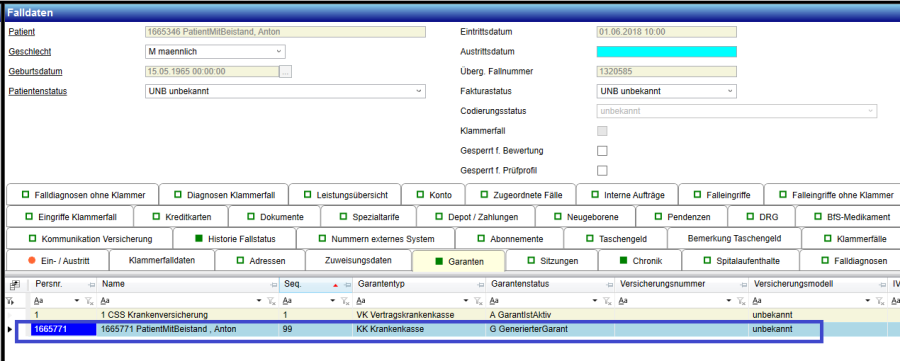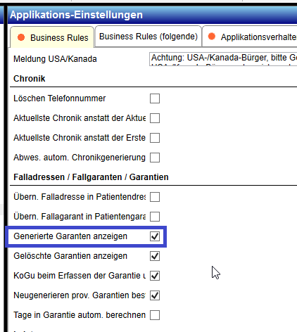 Dazu muss über das Programm-Setting 'Generierte Garanten anzeigen' sichergestellt werden, dass die generierten Garanten in der Applikation angezeigt werden. Dies gilt dann spitalweit für alle Fälle.