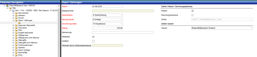 Bei der Erfassung eines Depots durch den Patienten oder seinen Beistand muss als Zahler immer der Patient eingetragen werden, da dieser auch Debitor ist. So ist sichergestellt, dass das Depot als Guthaben angerechnet wird.