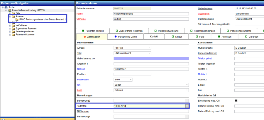 Verstirbt ein Patient, so wird die Gültigkeit einer bestehenden 'Rechnungsadresse ohne Debitor' auf das Todesdatum des Patienten begrenzt.