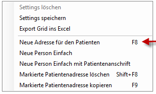 Patient suchen und entsprechende Patientendaten öffnen. Auf Register Adressen wechseln. Rechte Maustaste Neue Adresse für den Patienten oder F8 klicken.