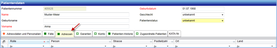 Die Zuordnung der Adressen wie folgt hinterlegen. Patient suchen und entsprechende Patientendaten öffnen. Auf Register Adressen wechseln.