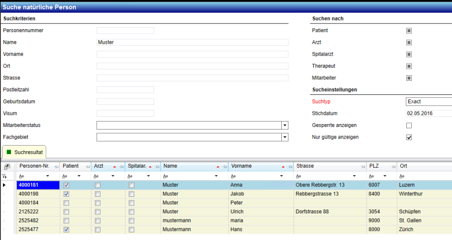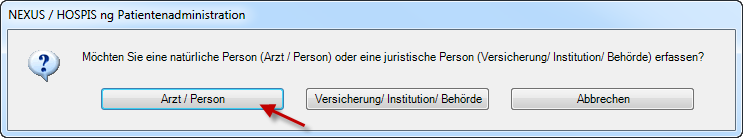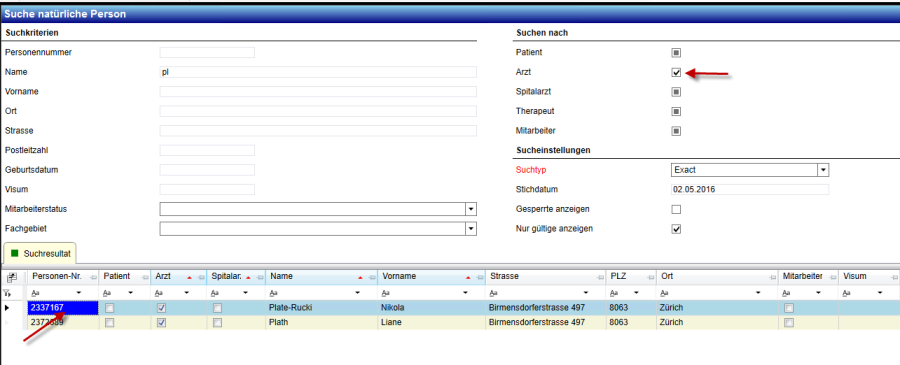 In der Maske Suche natürliche Person wird geprüft, ob der Arzt bereits vorhanden ist. In Auswahl die Person doppelklicken.