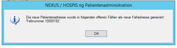 Je nach Konstellation erscheint die Meldung, dass die Patientenadresse in Fälle übernommen wurde.