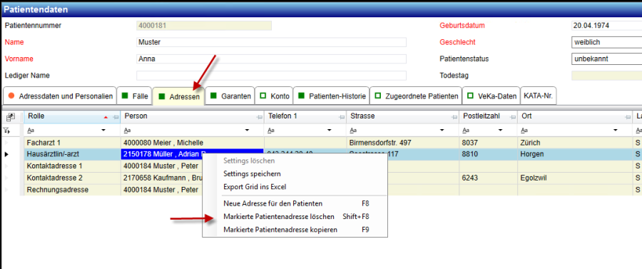 Dazu auf dem Register Adresse auf dem Patienten die gewünschte Rolle markieren und mit rechter Maustaste klicken und markierte Patientenadresse löschen wählen.