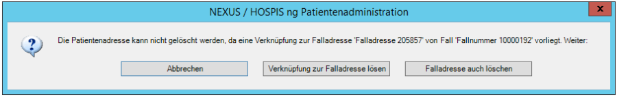Verknüpfung zur Falladresse lösen = Datensatz ist danach auf Patient nicht mehr vorhanden – aber noch auf dem genannten Fall weiterhin aktiv.