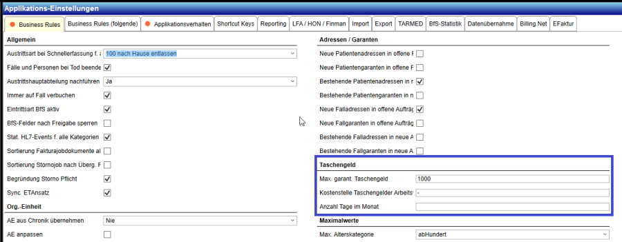 Limit Taschengeld Mit dieser Einstellung wird definiert, bis zu welchem Maximalbetrag pro Fall und Taschengeldgarant Taschengeld-Guthaben aus Taschengeldgarantie generiert werden sollen. Dieser Wert kann pro Garant beim Fall übersteuert werden.