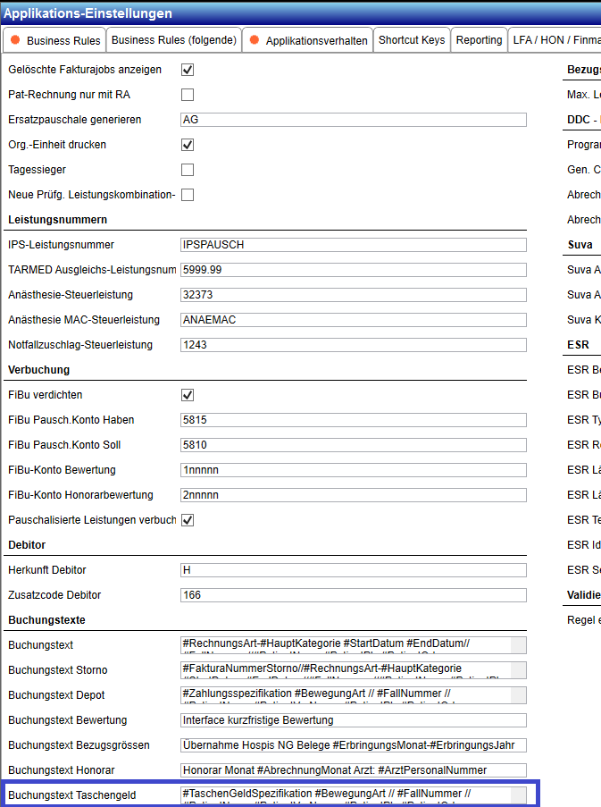 Buchungstext Taschengeld Hier wird hinterlegt, wie sich der Buchungstext für Taschengeldbewegungen zusammensetzt. Aktuell setzt sich dieser zusammen aus der Taschengeldspezifikation, der Bewegungsart, der Fallnummer, Name und Vorname des Patienten