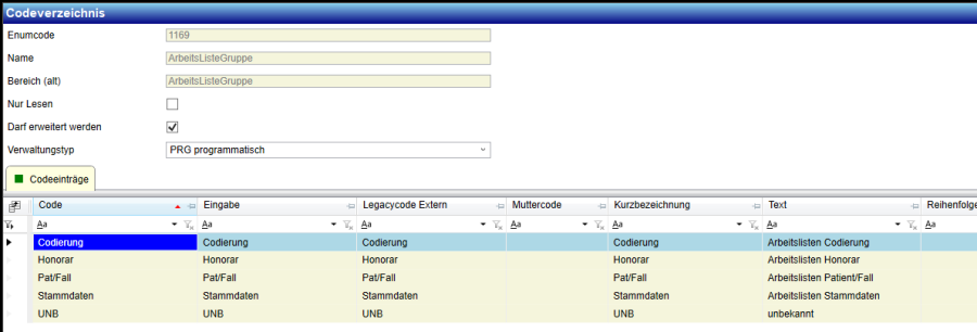 Für die Gruppierung der Arbeitslisten (siehe …), werden im Codebereich 'ArbeitsListeGruppe' die benötigten Gruppen hinterlegt.