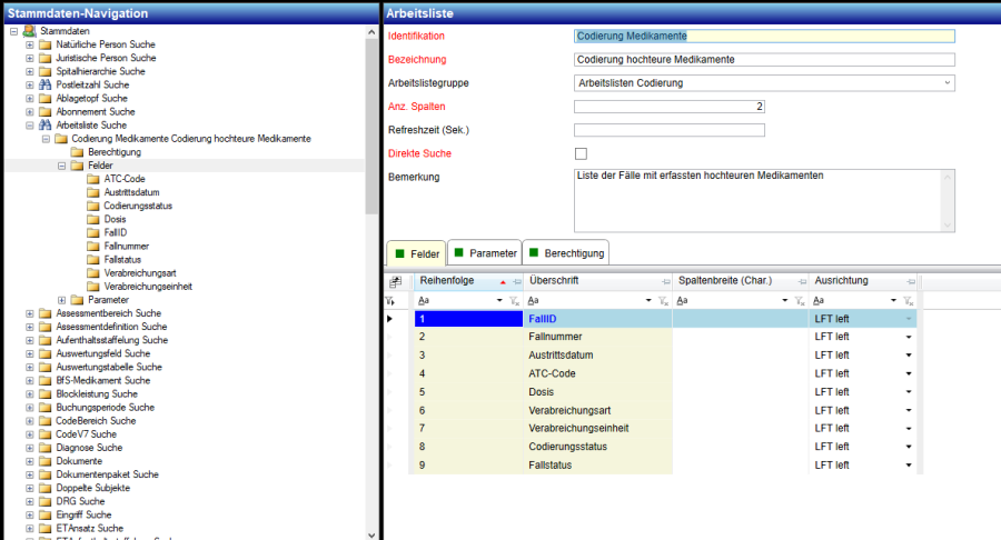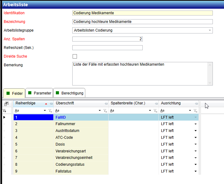 Hinweis: Die Spalten 'FallID' bzw. 'PatientID' müssen immer vorhanden sein, wenn aus der Arbeitsliste direkt auf den angezeigten Fall bzw. den angezeigten Patienten navigiert werden soll. Diese Spalten werden aber bei der Suchanzeige immer unterdrückt.