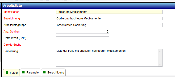 Für die Arbeitsliste können folgende Felder erfasst werden: