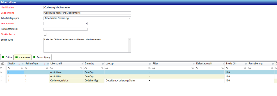 Sofern das SQL-Statement einer Arbeitsliste mit Suchparametern definiert wurde, werden diese im Reiter 'Parameter' angezeigt.