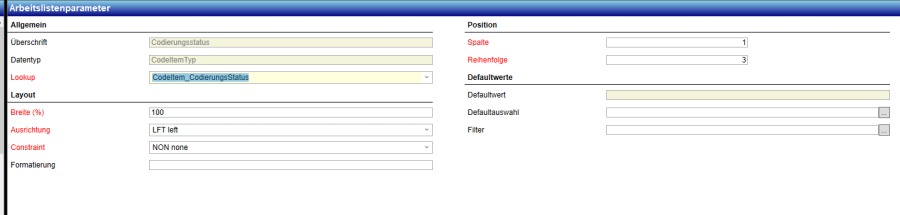 - DefaultAuswahl: Für Felder vom Datentyp 'CodeItem' kann hier der Defaultwert angegeben werden, also welche Werte als selektiert angezeigt werden.
