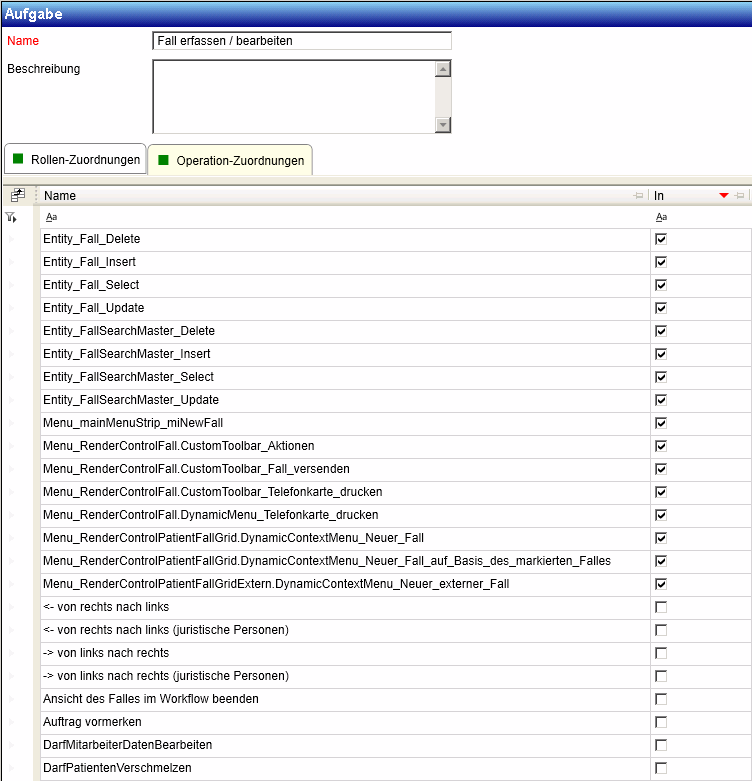 Die in Hospis PATng vorhanden Operationen können zu Aufgaben zusammengefasst werden. Eine Aufgabe enthält alle Operationen, die benötigt werden um diese Aufgabe durchzuführen und gegebenenfalls weitere Operationen, falls sich aus der Aufgabe weitere Rechte ergeben, die allgemein gültig sind. Beispiel: Jeder der einen Fall erfassen und mutieren darf, muss auch eine Telefonkarte drucken bzw. den Fall erneut über die Schnittstelle versenden können.