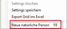 Die Arzterfassung erfolgt unter der Grobnavigation Stammdaten im Detail Natürliche Personen. Auf der Maske Suche natürliche Person muss zuerst nach dem gewünschten Arzt gesucht werden, damit sichergestellt ist, dass der Arzt nicht doch bereits vorhanden ist. Anschliessend mit F8 oder mit rechter Maustaste neue natürliche Person einsteigen.