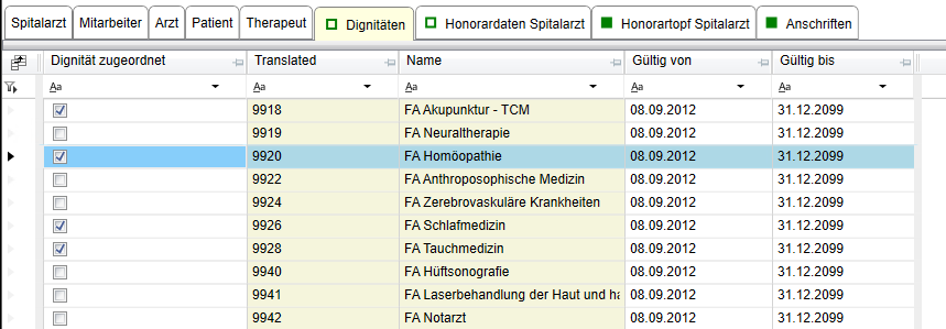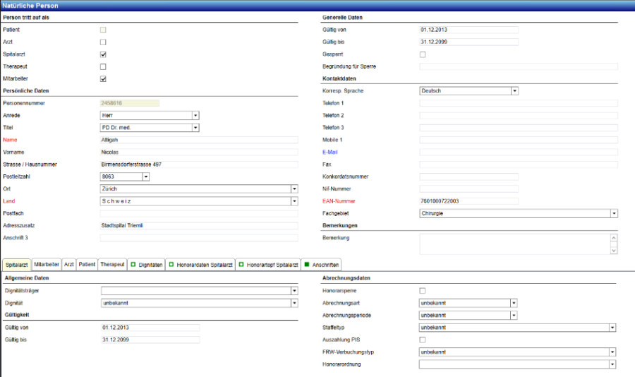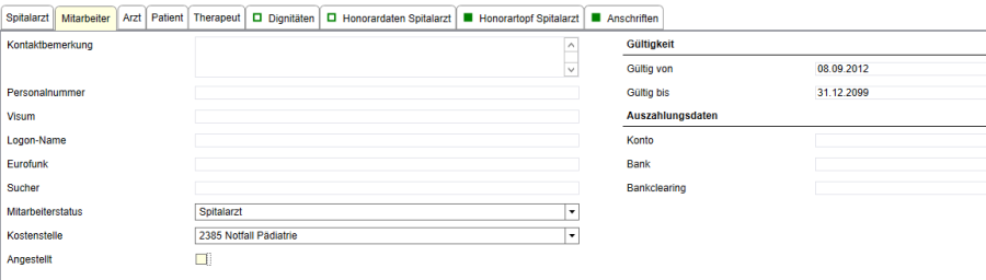 Bei Spitalärzten den Mitarbeiter Status Spitalarzt und die korrekte Kostenstelle erfassen. |